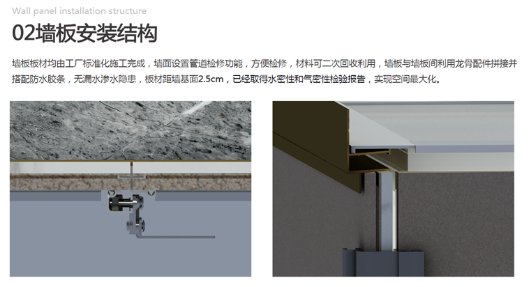 是通過對鋼板表面進行處理后,按現場尺寸定制折彎加工的墻板標準化產品;并采用獨特的飾面扣裝連接方式,安裝簡易便利,不打釘,不打膠,連接穩定牢靠,可拆卸回收。飾面材質和式樣有豐富的選擇和搭配,石紋、木紋、壁紙、壁布、涂裝板,滿足各種類型的裝修風格和設計需求。