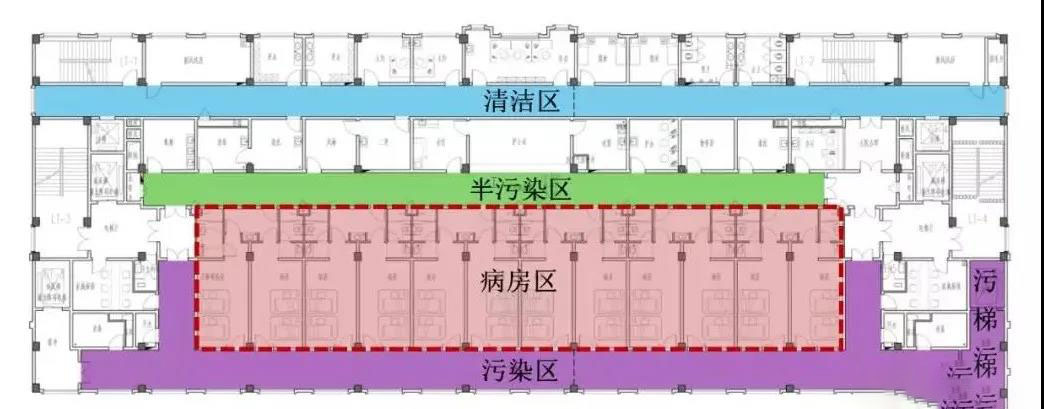 醫院四周為傳染病隔離區,有30米-50米,集中于傳染病病人隔離區。為了降低感染風險,住院樓醫院建筑平面被迫分為潔凈區、半污染區和污染區三個區域,每個區域都獨立分隔。采取不同的隔離措施和不同的布局為不同的功能室和不同的感染源。