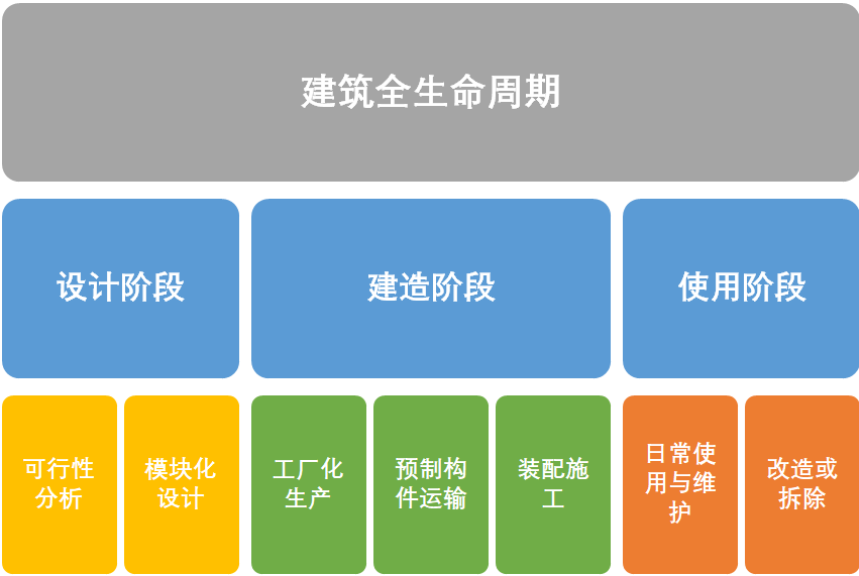 裝配式建筑的全生命周期階段火神山、雷神山醫院的“大國速度”,就是裝配式建筑與BIM(Building Information Modeling)、5G云計算技術的結晶:采用標準化、模塊化設計,通過BIM技術快速輸出整體建設方案,避免后期的返工整改;運用裝配式建筑技術,采用集裝箱活動板房,安裝便捷且整體性好,大大提高了施工進度。