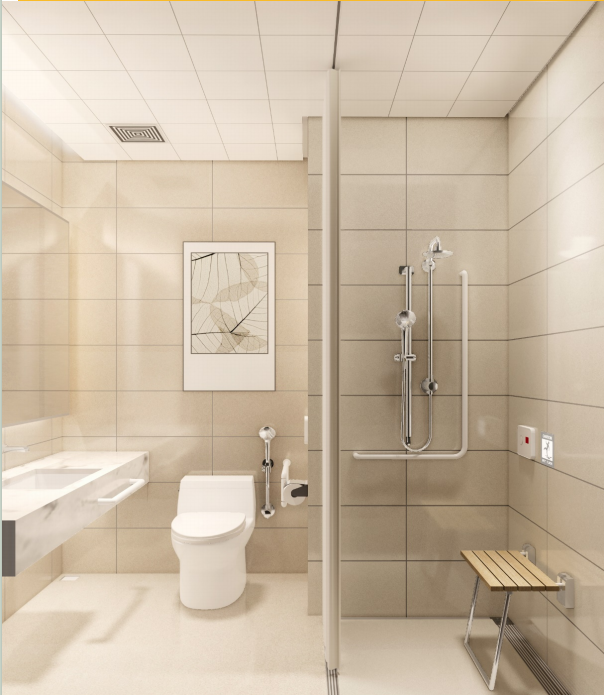 洗手間無障礙扶手、洗浴椅等建議使用PVC材料,也可采用防水復合板和不銹鋼支撐,為減少空間占用也可采用掛墻式洗浴椅,有的醫院在空間允許的條件下設置了砌體貼磚結構,但要注意施工防水作業。窗簾隔簾采用A級防火材料,嵌入式導軌為宜。